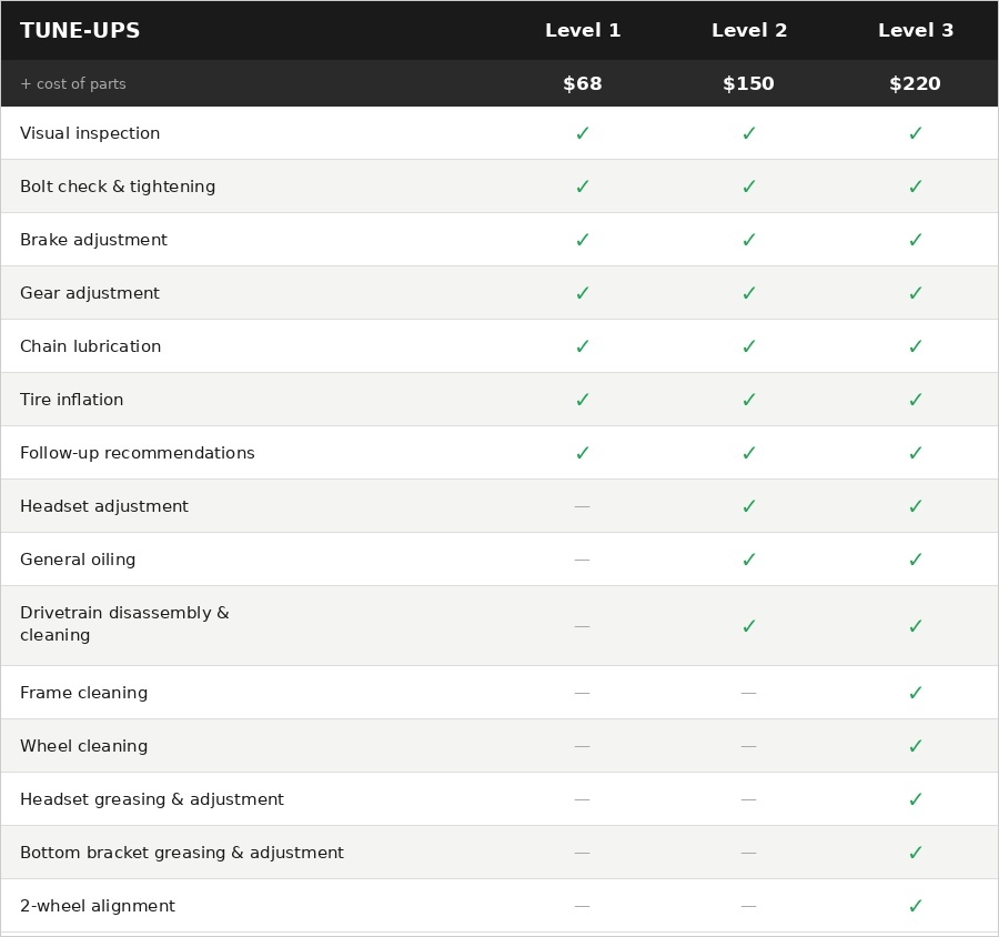 We invite you to book an appointment so we can determine which tune-up best suits your bike.